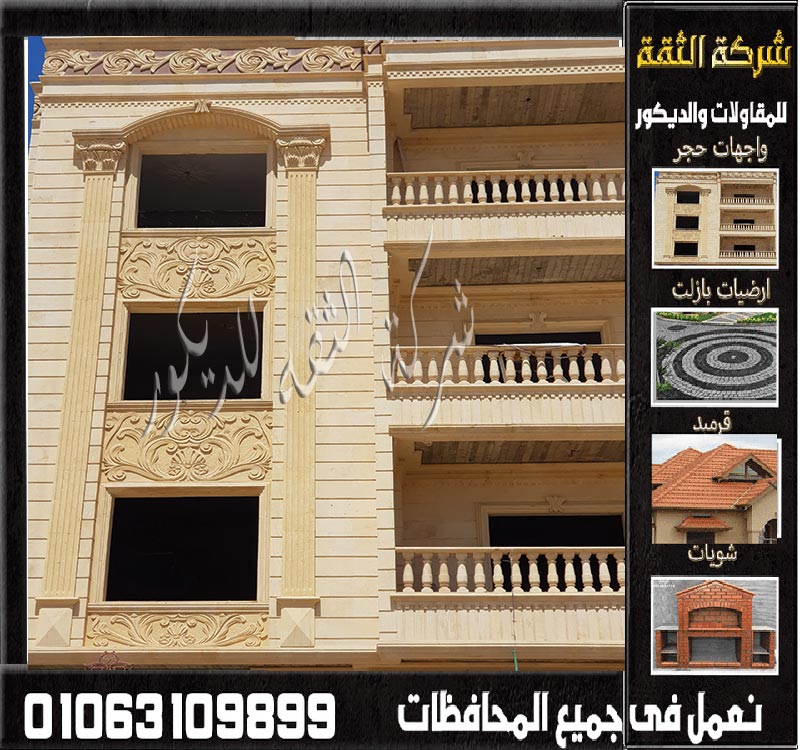 في بعض الواجهات يتم تنفيذ ديكورات حجرية خاصة مثل النحت المفرغ الذي قد يأخذ أشكالاً زخرفية مختلفة مثل زهرة اللوتس أو غيرها من الزخارف المعمارية. ويتم اختيار هذه التفاصيل بالتنسيق مع العميل حسب التصميم المعماري للواجهة.
